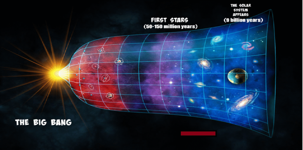 बिग बैंग सिद्धांत के अनुसार, ब्रह्मांड अपने प्रारंभिक विस्तार चरण के बाद कणों के निर्माण के लिए पर्याप्त रूप से ठंडा होना शुरू हुआ, जो बाद में परमाणु बन गए। मूल तत्व – हाइड्रोजन, हीलियम और लिथियम – गुरुत्वाकर्षण के माध्यम से संघनित हुए जिससे प्रारंभिक तारों और आकाशगंगाओं का निर्माण हुआ। सरल शब्दों में, यह कहा जा सकता है कि ब्रह्मांड 13.8 अरब वर्ष पहले ब्रह्मांडीय प्रणाली में विस्तारित हुआ और आकाशगंगा और सौर मंडल का निर्माण हुआ, जैसा कि हम जानते हैं।